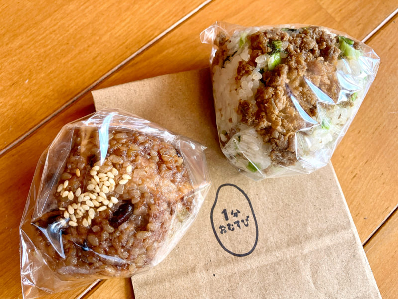 1分おむすびのおむすびです。5年前のオープン時からずっと気になっていたにもかかわらず、なんとなくタイミングが合わずに食べそこねていました。ようやくいただくことができました。店舗のすぐ裏の田んぼで育った無農薬米のおむすびは、どれもこれもすごくおいしそう。悩みに悩んで、KURKKU FIELDSとコラボした「ジビエ」と、甘い小豆の餡を玄米で包んだ「あんこ」を選びました。