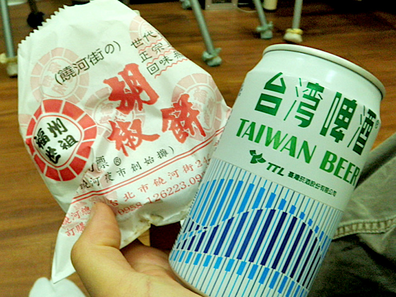 台湾で大人気のおやつと言えば胡椒餅です。胡椒がきいたお肉と青ネギがたっぷり入った具を、パリパリモチモチの生地で包み、釜の中でじっくり焼き上げていて、できたてはとてもとてもおいしいです。店によって具や皮などのバリエーションがありますが、ぼくは駅近くにある赤肉胡椒餅が大好き。焼きたては、やけどに注意です。
