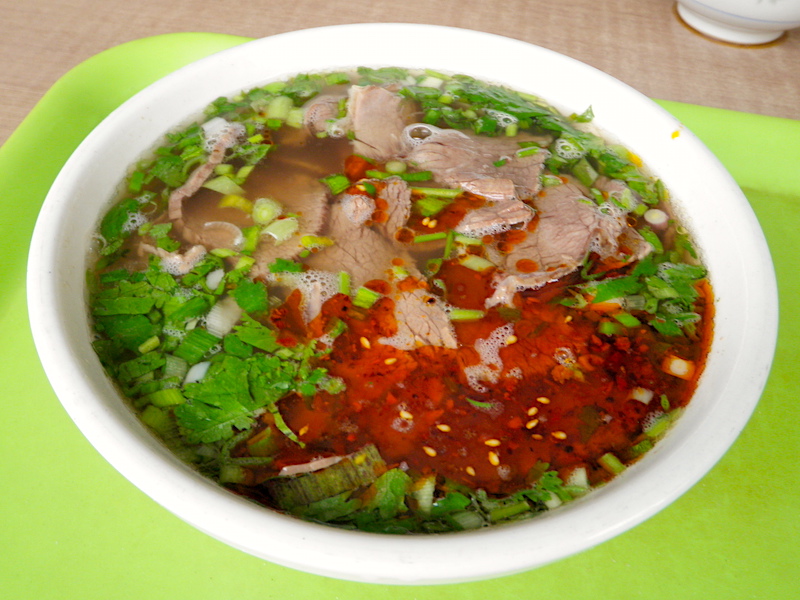 敦煌でお世話になったユースホステルのレセプションで、「この近所で何かおいしいもの、おすすめのものってない?」と聞いたら、パッと教えてくれたのがこの洪師傅牛肉拉面。牛肉麺は敦煌・蘭州あたりの名物料理で、牛でとったあっさりスープに、伸ばしたての手打ちの麺をあわせ、香菜とラー油で仕上げた麺料理です。さっぱりすっきり、でも奥深い、そりゃあそりゃあ、おいしいラーメンなのです。熱々スープとゆでたて麺で、口の中を火傷しつつも止まらない。1杯100円しないっていうのもしあわせです。
