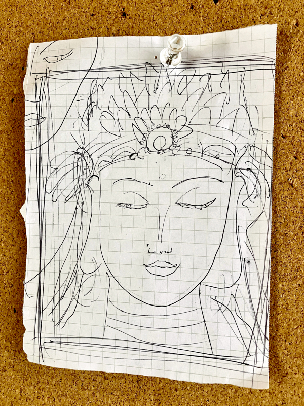 ぼくは絵心がありません。何度やっても(下の絵の左上に半分写っている)悪魔のようなおばあさんしか描けません。苦しかった。頭の中ではっきりと観えているお顔を写し取りたいのに、それがまったく叶わない。何度か諦めかけて、それでも!と手を動かしたら、奇跡の1枚が描けました。大袈裟でなく、あのときのぼくにとって、ここに現れた弥勒菩薩さまは救いの神そのものでした。