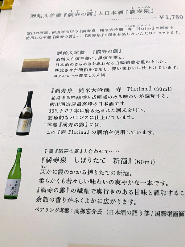 京都の満寿の露と満寿泉 by 月山 七緒 · 公開済み 2020-01-29 · 更新済み 2025-07-31 京都御所の西側すぐ近くにある虎屋菓寮京都一条店でいただいた羊羹と日本酒です。富山の銘酒である満寿泉の酒粕を練り込んだ羊羹と、「純米大吟醸「寿」 プラチナラベル」「満寿泉しぼりたて新酒」をいただきました。おおお、これはすごいや。正確のまったく違う2種類のお酒それぞれが羊羹とマッチしていてとてもおいしいです。ぼくはあまり日本酒が得意ではありませんが、あっという間に食べてしまった。ごちそうさまでした。