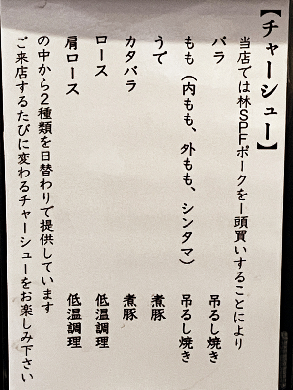 木更津で人気のラーメン店、麺のマルタイの特製背脂煮干しらーめんです。オープン当初に一度お邪魔して、それきりなかなか訪れる機会がありませんでした。実に9年ぶりのマルタイはとてもおいしい再会になりました。スープは以前よりも洗練された感じがしますし、麺、チャーシュー、メンマ、煮卵、海苔、それぞれもすごく味わい深い。すべての一体感が心地よいです。日替わりで選ばれるチャーシュー、今日は「ロース」と「うで」でした。部位の違うチャーシューが食べられるのは嬉しいです。またいけたらいいなあ。