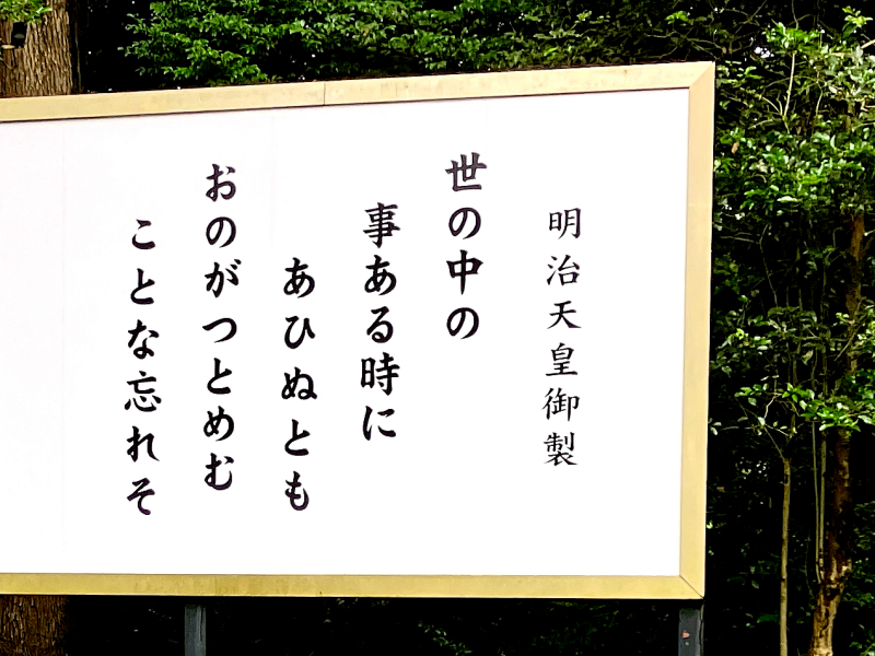 明治神宮をお参りさせていただいた際、拝読した明治天皇の和歌です。「世の中の 事ある時に あひぬとも おのがつとめむ ことな忘れそ」。現代語訳としては「世の中の大きな出来事に遭遇したときこそ、自身にとっての大事な務めを忘れてはならない」といった感じでしょうか。