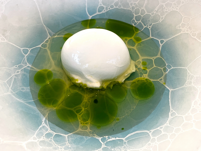これがすごいのですよ。できたてほやほやのチーズは、外の皮をスプーンで破くと中身がとろりと流れ出してきます。フレッシュさと濃厚さが渾然一体となって、今まで食べたことのない澄み切ったチーズの味わいです。そこに酸味のあるスープと華やかなソースを合わせると味が立体的になって複雑さを増します。驚きのおいしさでした。また食べたいです。