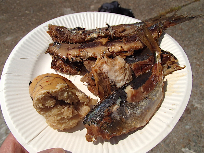 宗像大社の奥宮である沖津宮での神事に参加しました。普段は禁足地になっており、近づくことすらできないのです。神事を終えたあとは地元の漁師さんたちが釣り上げた魚をいただきました。アジ、イワシ、サバを豪快に煮つけたものです。心していただきました。おいしかった。