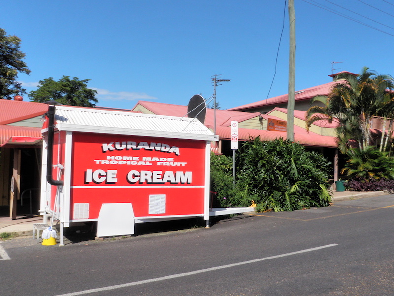 ケアンズのキュランダにある KURANDA HOME MADE TROPICAL FRUITS ICE CREAM。日本語も少し話せるおじさんとのやりとりが楽しいお店です。アイスは全部、おじさんの奥様ベティーさんのアイディアをもとに手作りしてます。ぼくの食べたマンゴアイス、おいしかったなあ。
